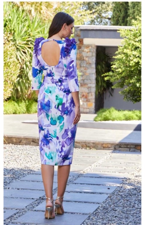 VESTIDO MIDI FLORAL CON VOLANTES EN HOMBROS.